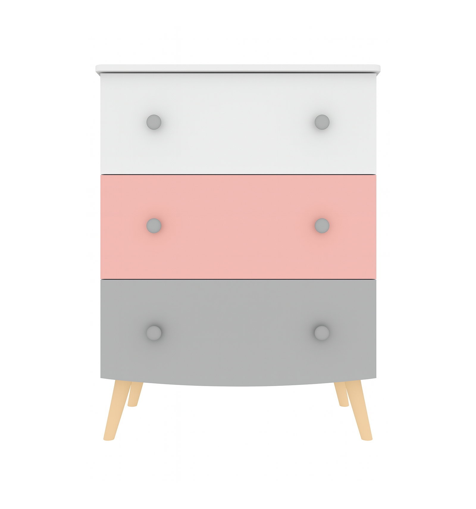 Son design associe les couleurs blanc, rose et gris, créant une atmosphère douce et accueillante, parfaite pour toute chambre d'enfant. Les poignées rondes en ton métallique ajoutent une touche d'élégance et de simplicité à l'ensemble, tandis que les pieds inclinés de style rétro renforcent son esthétique intemporelle et fraîche. Cette commode, qui fait partie de la ligne Ringo, est conçue pour s'adapter à divers styles de décoration, des plus modernes aux plus classiques, garantissant un équilibre entre fonctionnalité et style.